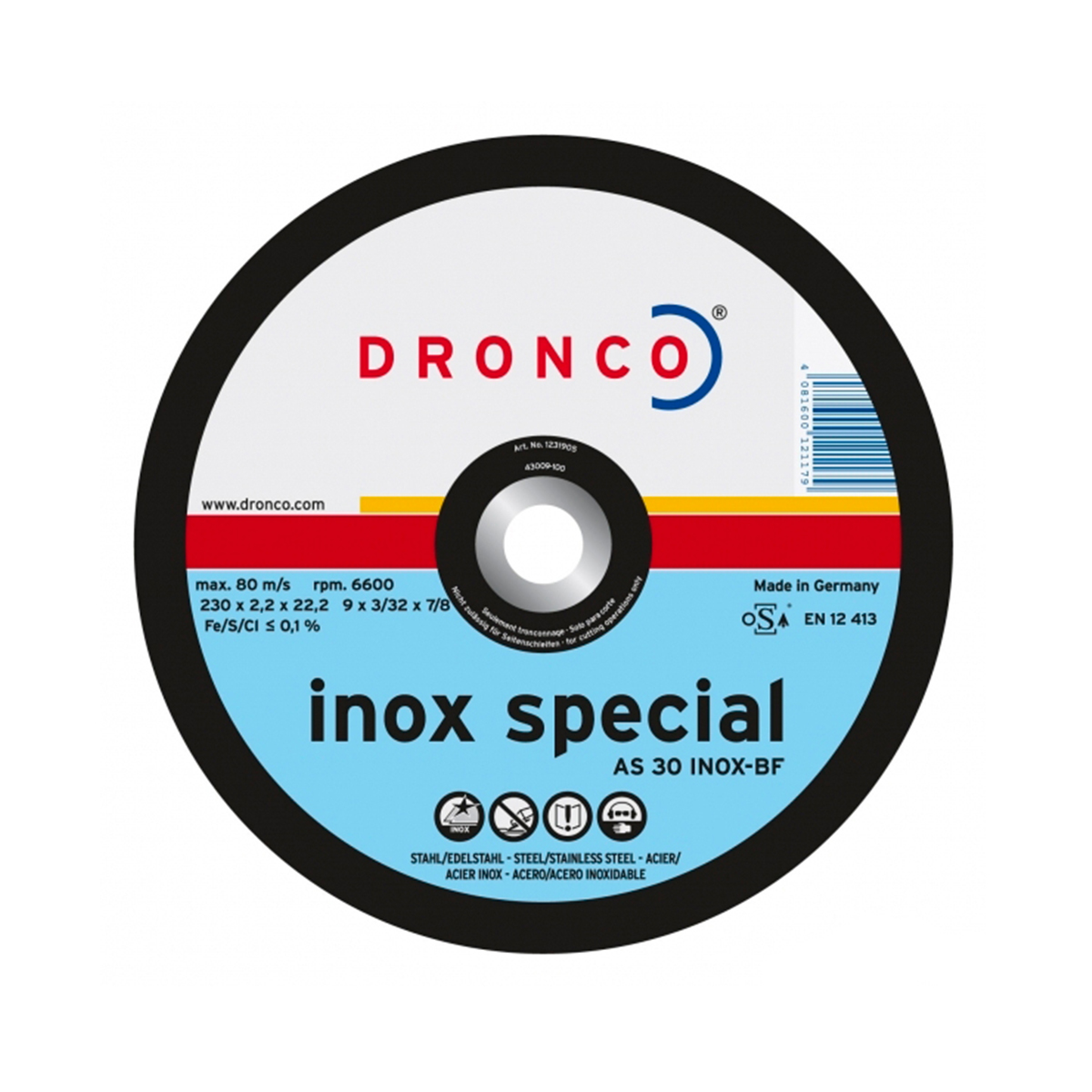 Диск отрезной немецкого бренда Dronco-специальный круг для резки высокосортной стали. Благодаря структуре абразивного материала, не содержащей железа, серы и хлора, исключается образование ржавчины на режущих кромках. Имеет также хороший срок службы при обработке обыкновенной стали.